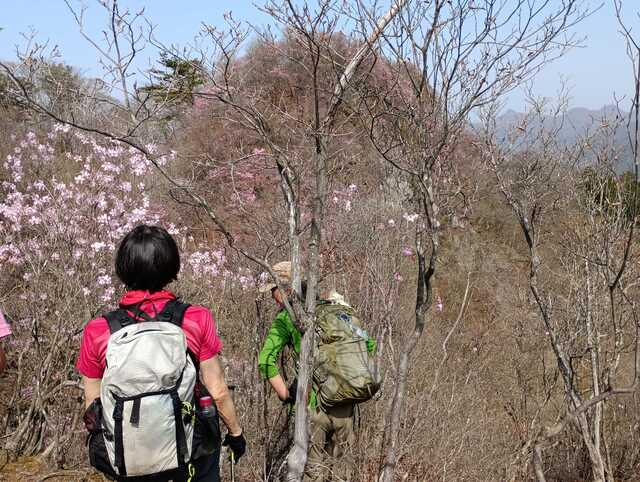 杉林の急登をゆっくり進む。竜王大権現近くになると空が開けて岩肌にミツバツツジが咲いている。