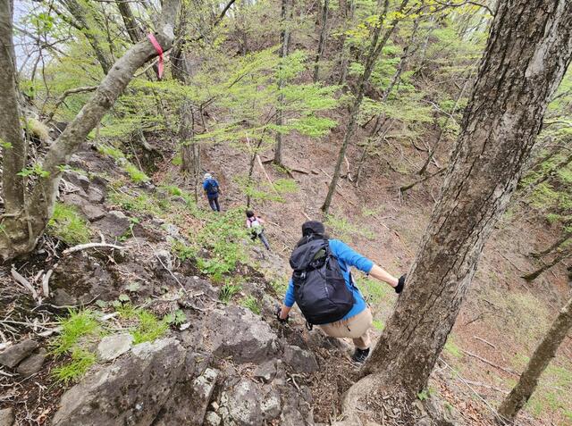 戻って稜線を南西の尖った岩のほうへ。右下にはシャクナゲの花、上には名残のアカヤシオ。