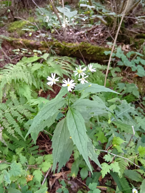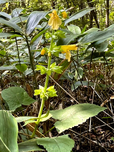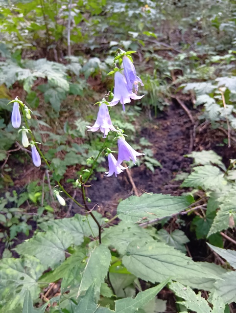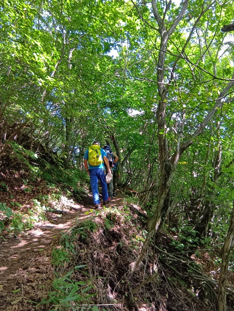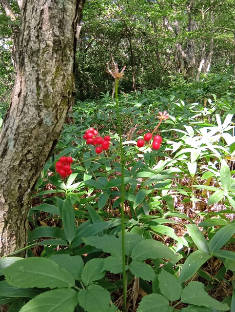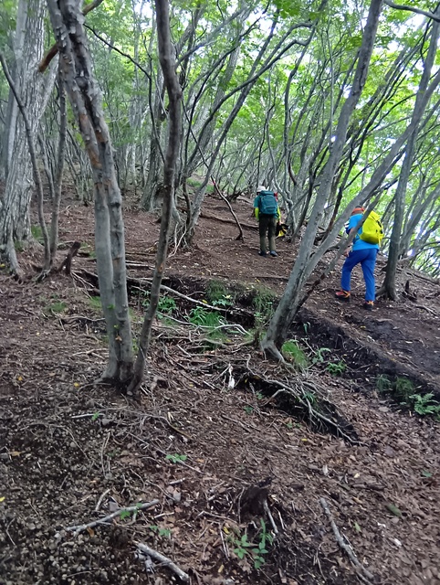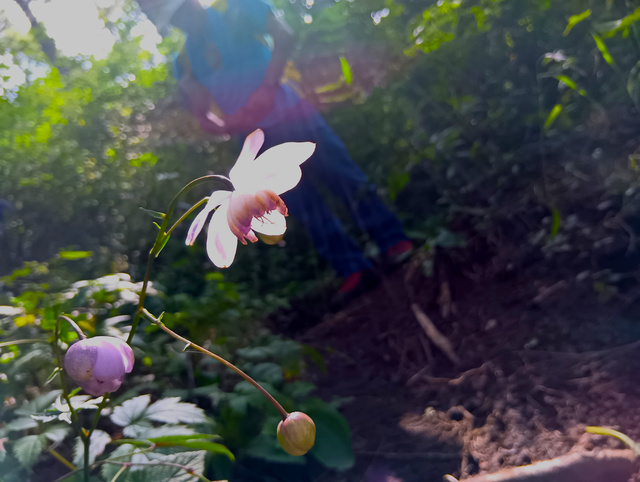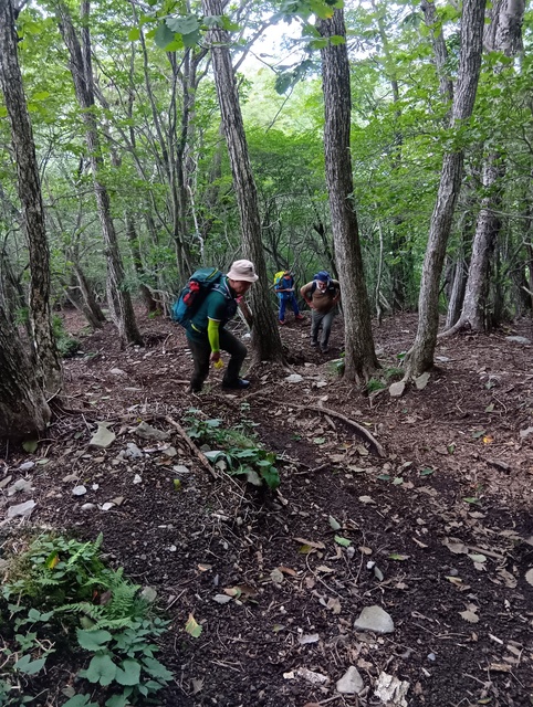 脱水症状回復明けの私は、多分、最後はへばるだろうなとの予測をおくびにもださず、全体ペースを維持しながらコース稜線まで上がる。途中、早くも、レンゲショウマが数本花をひらき出迎えてくれた。群生とはいかずとも幸せ感をいただいた。しばらく平坦ルートを歩み、さあ、急登を迎えた。