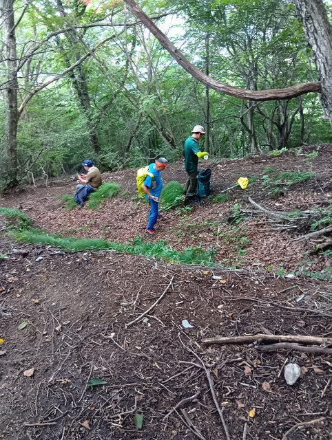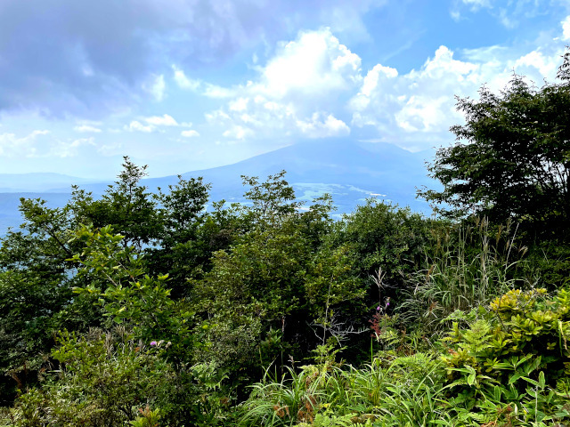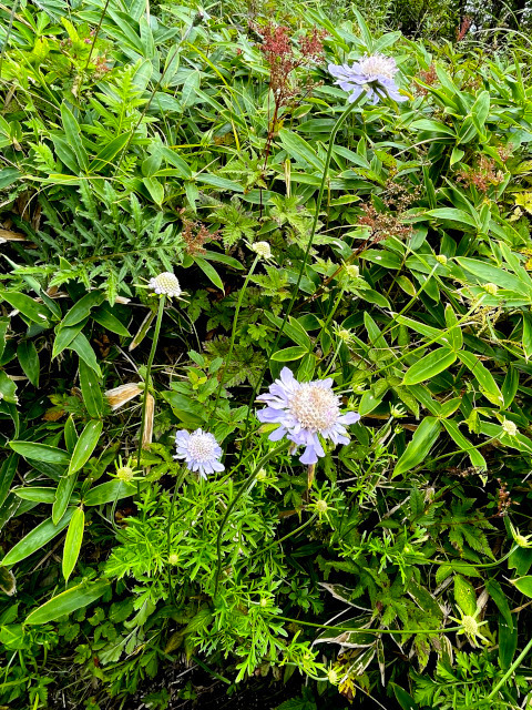 汗がだんだん噴き出てきた。徐々に皆から遅れてきた。最後の30m先の分岐までなかなか体の踏ん張りが出来なくなった。もう少し平地での回復期間が必要だとの認識に至る。さらに頂上まで進みが遅くなる。山行仲間は気をつかい、かなりのスローペースで私を待つが、追いつかない。この辺りに松虫草が咲いていた。それでも頂上は近いので、何とか頂上へ到着。ワンちゃんを連れた家族グルーブや女性同士など数グループが食事休憩中、我等も一息どころか大休止。眺めは木々が生い茂ったため360度の絶景は少し削減気味。「自然だから、木も茂るか」との眺めとなっている。 頂上は風もあり涼しさで汗も引く。紫の松虫草も咲き、早くも秋の装いを感じられる。下りはスムーズにトットと下ってきたが、途中で女史が一人、連れとはぐれ、見なかったですかとのこと。低山は道が多く、はぐれるとどこ行くかわからなくなるため、初心者は特に注意が必要と思います。