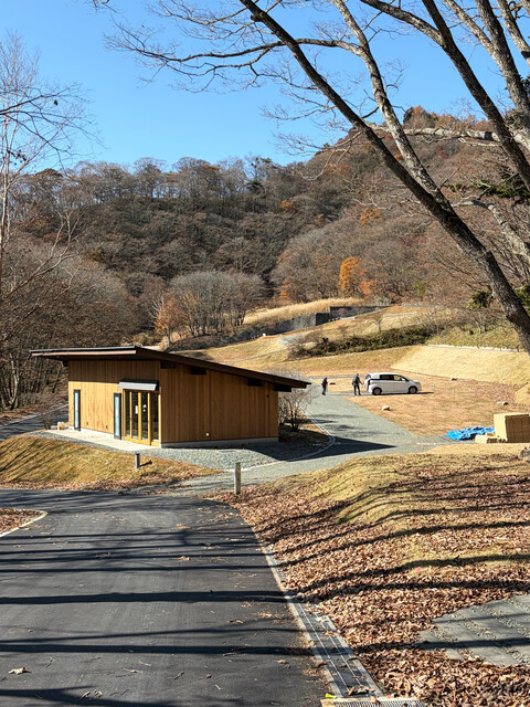 それでも小春日和を感じさせる初冬の快晴日、コースの容易さも手伝い、気持ちよさが駆け抜けていく景色を堪能できる。陣笠山頂で小休止のおやつタイム。 昼食にはまだ早い。足柄山(鍬柄山ではない)を往復して、このコースでは急な下降路を通り、アスファルト道路に下山した。広いキャンプ場を建設中で至る所を建設中、来年には立派なオートキャンプ場ができるでしょう。