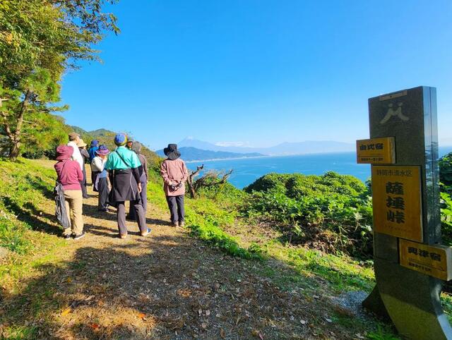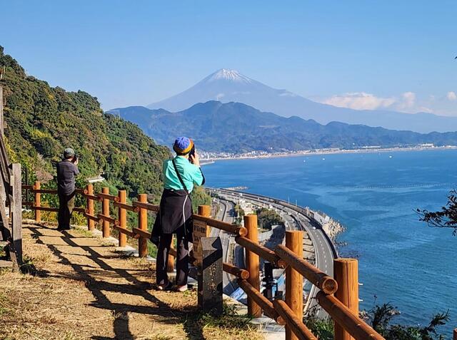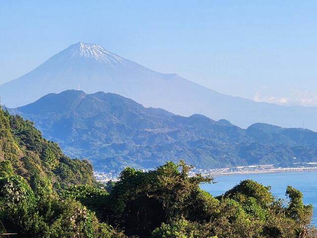 まずは薩埵峠から富士山を見ようと、とんでもない急坂の道路を上り、峠の駐車場へ。無人販売所の大振りな冬みかんをゲットしてから、稜線に上がる道に入る。が、どう見ても観光客が歩く道ではない。結局道路を興津方面にしばらく行ってから、それらしい道を見つけて稜線に上りつめ、かつての薩埵峠道と思われる遊歩道に出て、展望台に着くことができた。かなりの大回りでこのところの当会の悪い癖が表面化したとも言える(笑)。